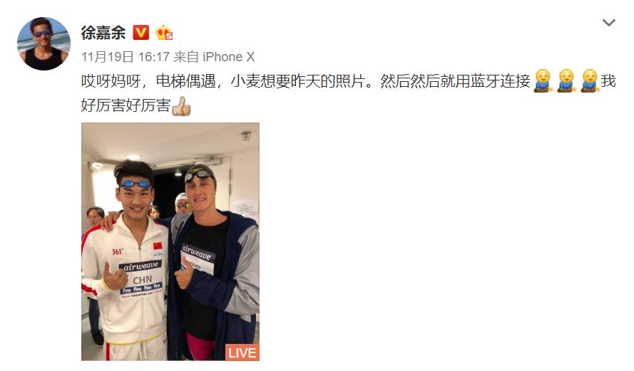 国际泳联短池世界杯正在进行,近日,徐嘉余在自己的社交网络上晒出了与澳洲名将麦克沃伊的合影。此前,徐嘉余还开玩笑道:“小麦多次跟我搭话还愿意跟我尬聊,为了他,我得好好学习英语听力了。”