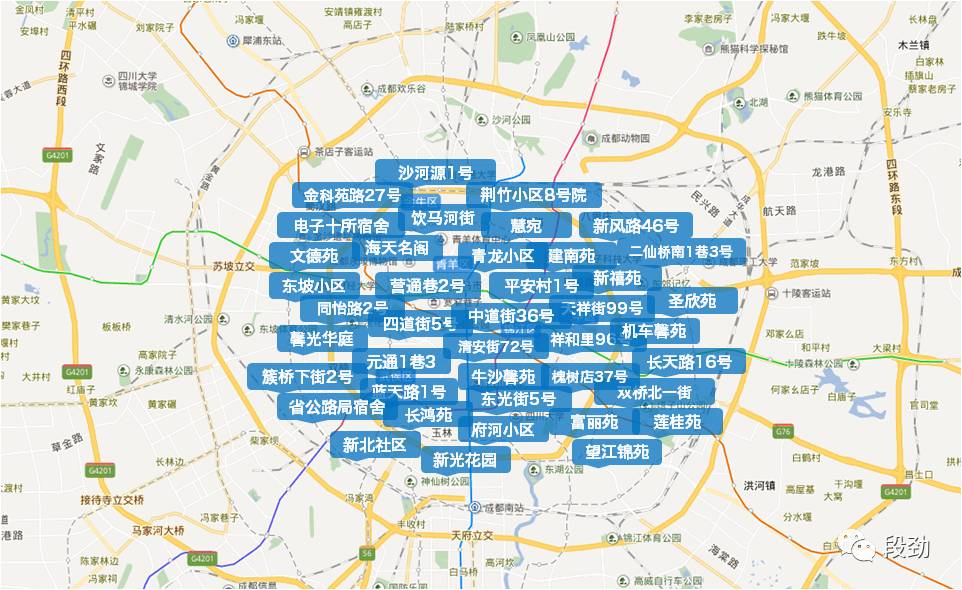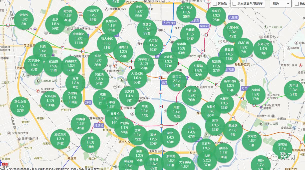 为了对比下数据情况,我随机选择了成华区建设路附近的2个老破小、2个次新大盘以及1个新盘,与之相对应的,选择了东西南北二圈层的老破小5个。