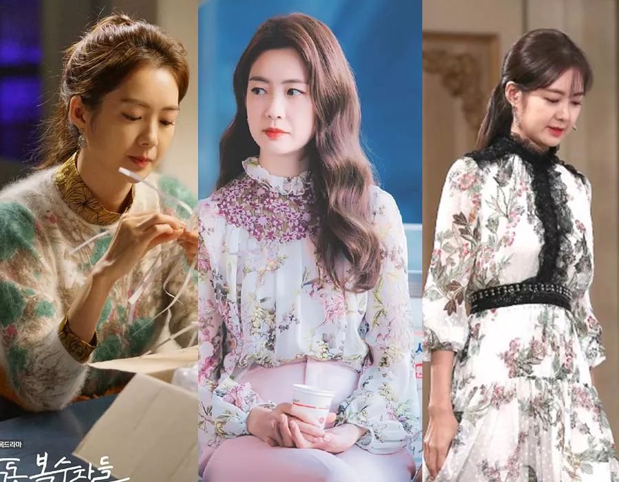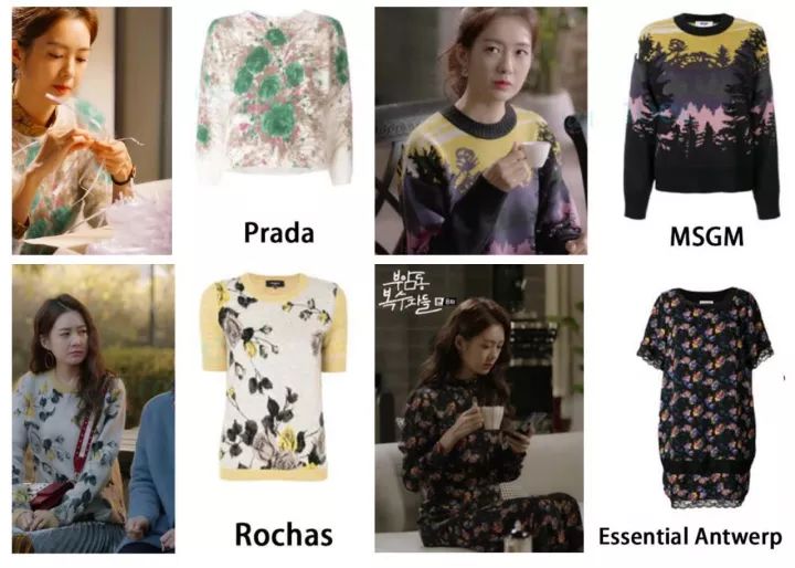 为了突出活泼感,整个剧中金正惠还穿了大量的色彩和浪漫的印花,当然她的印花也多为邻近色的配色、低饱和度配色,不会太过跳跃!