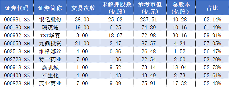 银亿股份(000981.SZ)目前股票质押比例高达62.14%,居于众上市公司之首。数据显示,该公司共发生过49次股权质押交易,还有38笔未解押,后者参考市值达237.51亿元,其中近四成将在年内迎来质押的截止日期。分析银亿股份的股票质押明细可见,其未解押部分共涉及7位股东,其中宁波圣洲投资、宁波银亿控股和熊基凯三位股东质押股票参考市值均在60亿元以上。西藏银亿投资质押部分股票参考市值也超过了35亿元。