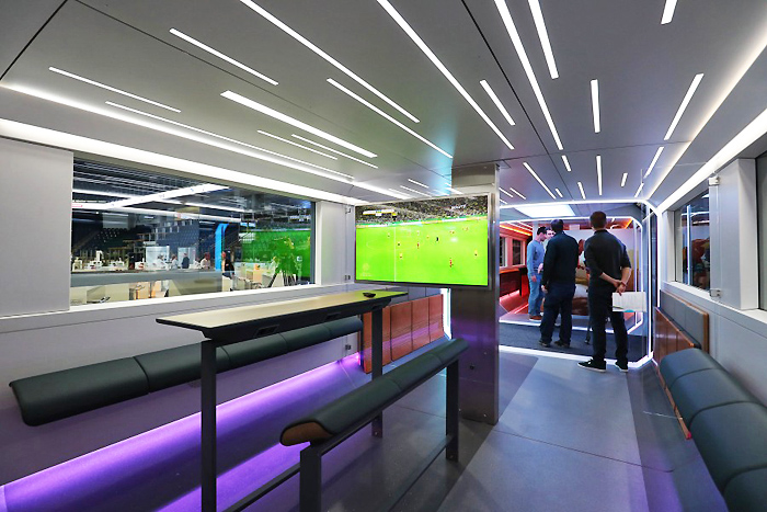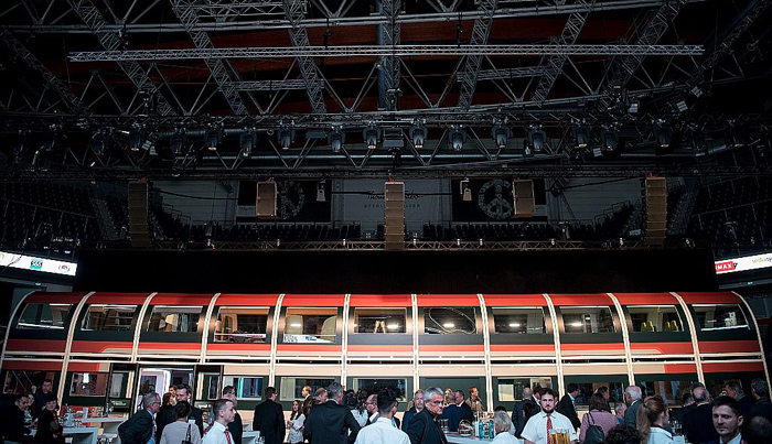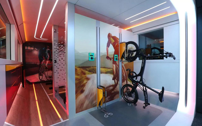 在纽伦堡市的展览会上,这辆初次亮相的双层火车,从外观看去就像一个尺码更大的旅游双层巴士,但真正的亮点在于它的内部:传统火车内一排排整齐排列的座椅不见了,取而代之的是各种不同功能空间的排列组合,健身区、餐饮区、公共休息区、私人区域等分割有序,甚至还有专供儿童玩耍的亲子区域,以及专为喜欢电玩的人设置的带有电视机和遥控器的游戏单间等。