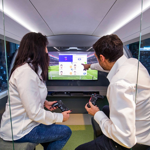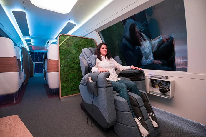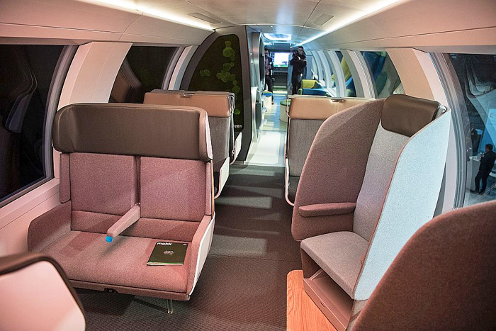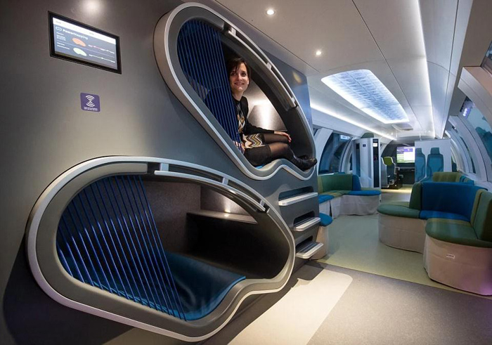 在私人区域内,座椅当然是最重要的,在“未来列车”中,乘客不用再为找不到合心意的座位而发愁:如果最需要安静,可以选择具有吸音降噪功能的座椅,如果想要躺下休息,可以爬进一个形状有些像胶囊空间的“睡眠吊舱”内,如果想要一个人工作或是休憩的独立空间,可以选择靠窗的单人隔间,关上拉门便可将噪音隔绝在外面。此外,车厢内还设置了不少可任意旋转的座椅,供乘客调试。