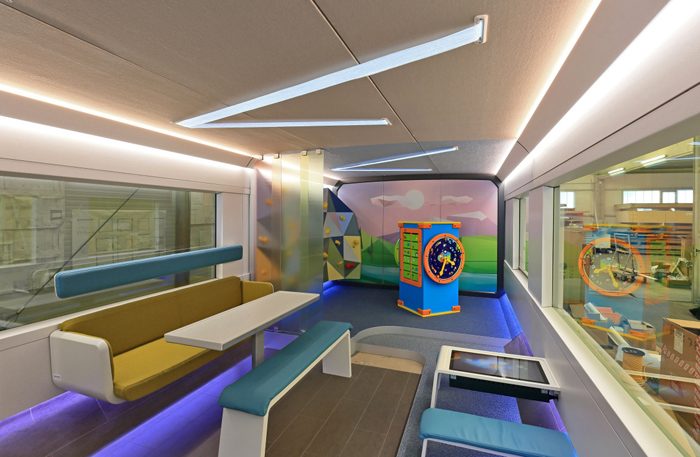 健身房内配有运动自行车和“虚拟教练”机器,在上、下班途中顺便健个身也许是不错的选择;儿童游戏区的桌子内部镶嵌了平板电脑,让陪同的大人可以在孩子们自己玩耍的时间内稍做消遣。