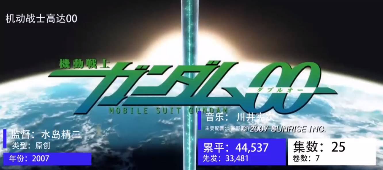 Seed续作的失败让日升不得不启用新的策划和监督,于是,《高达00》第一部和第二部先后于2007年10月和2008年10月播出,由执导过《钢炼03》的水岛精二担任监督,以四名高达驾驶员的成长为故事主线,以人与人之间的互相理解为主题。宫野真守,三木真一郎,神谷浩史,吉野裕行等大牌声优加盟,可以说取得的商业化效果基本让日升满意。