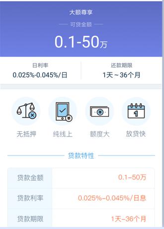 在陆金所APP页面中显示,其大额尊享产品日息在0.025%~0.045%/日,还款期限为1天~36个月。此外,大额尊享产品在完成陆金所实名认证、开启手机定位功能、进行银行卡验证和人脸识别等步骤后,上传资料成功即完成授信,实现额度申请。但是在是否还会收取其他服务费这方面并没有给出相关说明。
