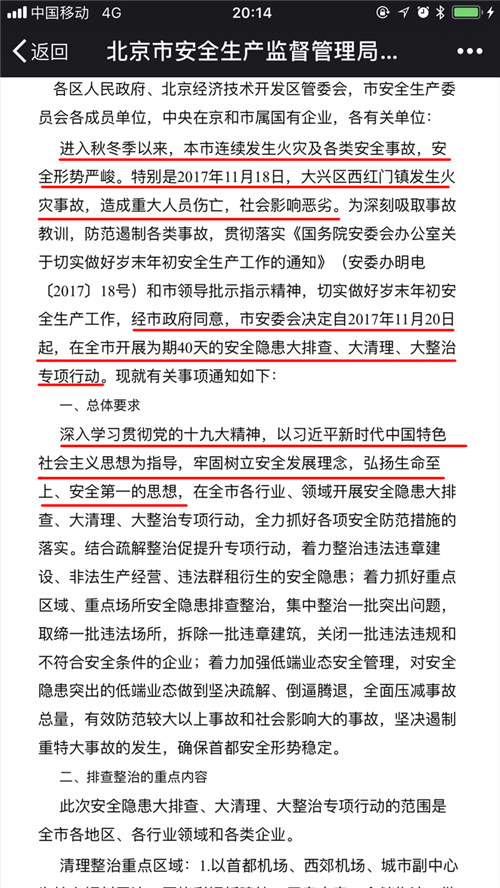 11月20日,北京市安全生产委员会下发《关于开展安全隐患大排查大清理大整治专项行动的通知》,称进入秋冬季以来,本市连续发生火灾及各类安全事故,安全形势严峻。特别是2017年11月18日,大兴区西红门镇发生火灾事故,造成重大人员伤亡,社会影响恶劣。市安委会决定自2017年11月20日起,在全市开展为期40天的安全隐患大排查、大清理、大整治专项行动。