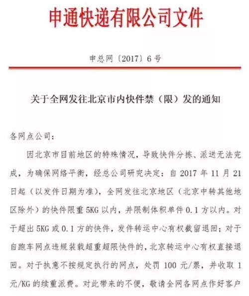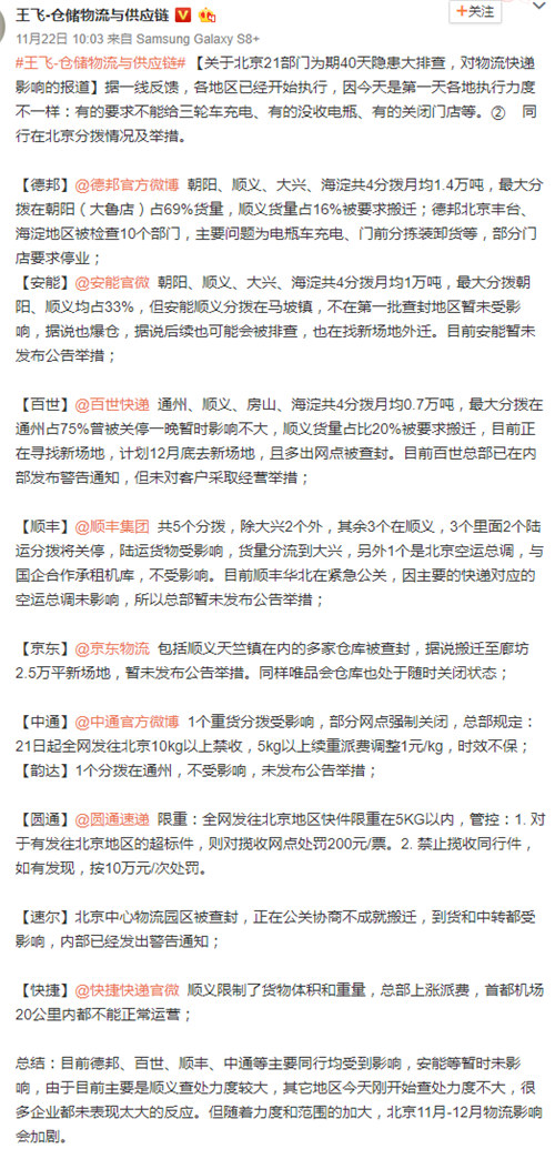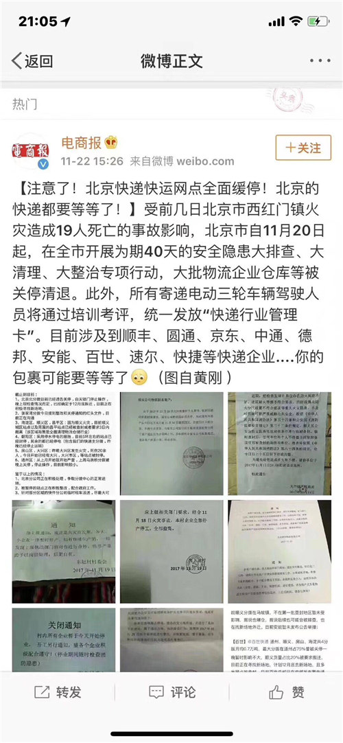 上述通知最直观的感受来自快递物流行业。从11月22日,有媒体报道称,北京快递快运网点全面缓停,“北京的快递要等等了”。