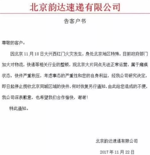 随后,多家物流公司发出或紧急或抱歉的通知: