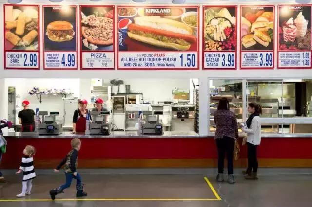 Costco的熟食也很接地气,这里的披萨和热狗都很受欢迎。甚至有人戏谑说,Costco才是全世界最大的披萨连锁店。住在Costco的附近,你甚至可以在肚子饿了的时候拨打Costco披萨热线,来一份皮薄馅大,哦不对,芝香四溢的大披萨。此外,Costco的热狗销量也十分惊人,竟然是美国棒球大联盟体育场的4倍。你如果在Costco逛累了,就可以没有一点点犹豫也没有一丝顾虑地花1.5美元——这是30年都没有变过的价格——购买一个热狗加一杯苏打水,小憩一下。