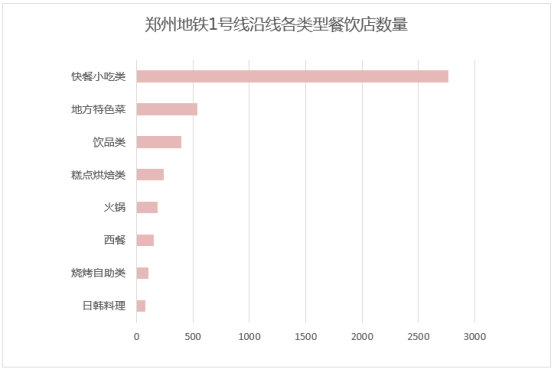 郑州1号线一期全长全长26.2公里,沿途共设20个站点,于2013年12月底开通。本次统计范围为沿线站点周边500米半径,共统计到餐饮门店4456家,餐饮店平均密度约为300家/平方公里。