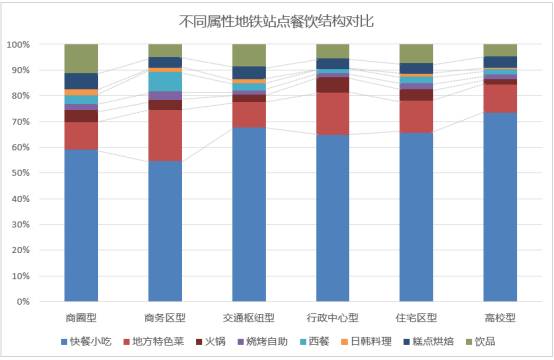 与此同时,由于地铁站点所处区域属性的不同,其周边的餐饮结构也各有特点,比如快餐小吃类餐饮在高校型地铁站点周边的比重比在其他类型站点的占比更高等,其次为交通枢纽型。