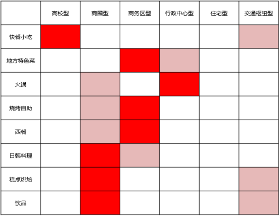(上图红色块表示某类型餐饮最高占比出现在哪个区,粉色块则表示占比次之)