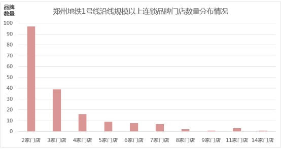 所有的品牌连锁店当中,在统计区域范围内门店数量达到2家以上的连锁品牌共有183个,从具体门店数量分布上看,超过一半品牌仅开了两家门店。