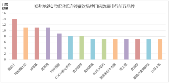 从具体连锁品牌上看,门店数量排名前五的连锁品牌共计14个,涵盖西式快餐、中式快餐、小吃及饮品等类型。由此可以看出,快速消费类连锁品牌在地铁站周边广受欢迎。