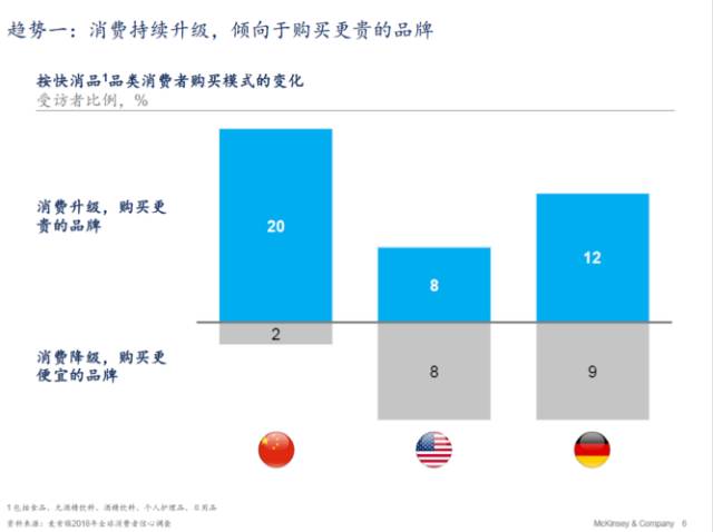 如果将中国和别的国家相比的话,20%的中国受访者认为他们在消费升级后会购买更贵的品牌,这远远超过美国和德国的比例,中国消费者更加倾向于购买更贵的品牌。
