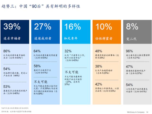 中国90后是新一代,不同于70后/80后,和00后也不同。相较于西方的千禧一代,中国的90后对中国的国家的状况有信心,比西方的千禧一代高出一倍。他们购买产品的时候希望体现他们自己的个性,所以在中国的90后逐渐成熟的过程中,对自我个性的表现和对品牌的认知越来越强。