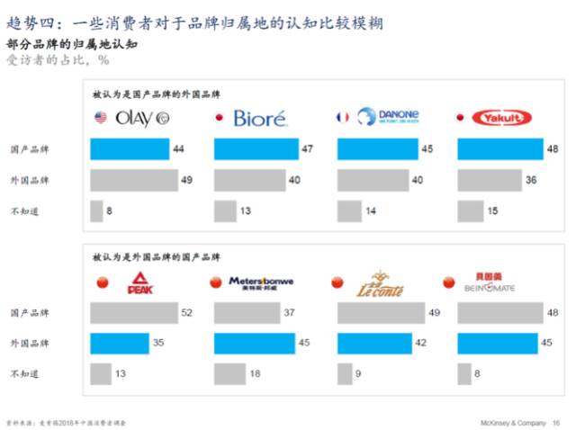 消费者对品牌产地的认知比较的模糊,上图中有几个例子,有几个国外的品牌,大概有一半的人认为他们是国内的品牌。相反的对于一些国内的品牌来说,也有一半的人认为它们是国外的品牌。这是一个好的现象,很多的国外品牌在本土化这个事情做得越来越好,被消费者当成了国内的品牌。反之,国内品牌向国外的品牌学习做得越来越好。