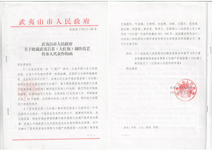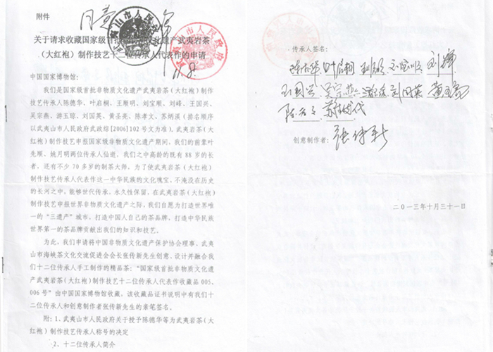 为了永久性地留住这股“岩骨花香”,2013年,在当地政府的大力支持下,当年武夷岩茶国家级申遗的主负责人张传新先生,经过12位非遗传承人的签名授权后,首次集合了这12位武夷岩茶(大红袍)制作技艺非遗传承人的代表作,送藏中国国家博物馆。