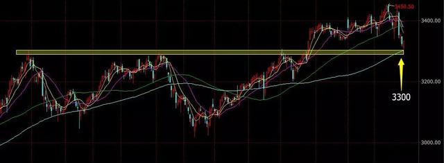 这是上证指数的走势图,最近的一个支撑位置在黄色横线所处的3300的位置上,从图形上来看,上证指数跌到3300点左右,可能会遇到同样认为这是一个支撑位置的资金的买入。
