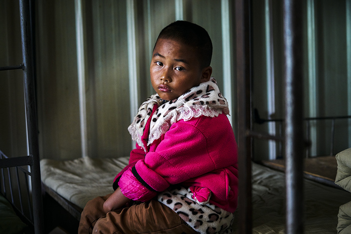 16. 一位只有6岁的男孩在康复中心和戒毒的母亲一起生活。他穿着一件粉红色外套,那是一个已经离开康复中心的小女孩没带走的衣服。