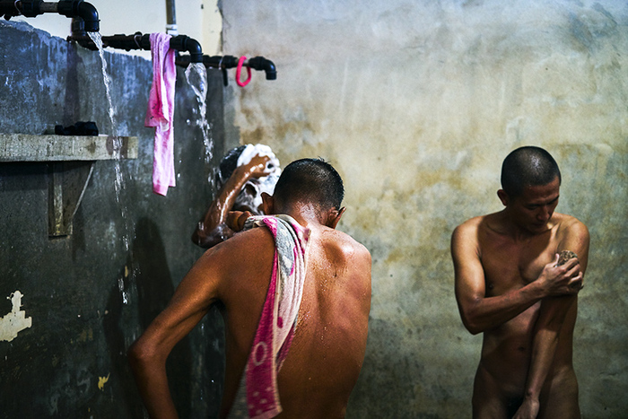 8. 下午两点,一天中气温最高的时候,戒毒人员在洗凉水澡。毒品曾经侵蚀他们的身体,而在康复中心,一些戒毒人员将洗凉水澡视为锻炼的一种方式。