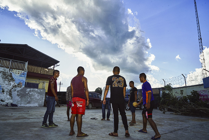 20. 年轻的戒毒康复人员在玩踢竹编球接力赛。这是不同批次到来的戒毒人员之间建立感情、培养默契的重要形式之一。