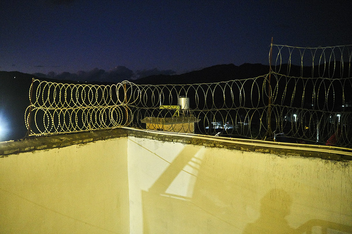 13. 夜晚的康复中心灯火明亮,墙上映着戒毒人员的影子。尽管康复中心从未发生过人员逃脱事件,但为规范管理,更多是出于对忍受戒断反应的人员保护,墙上还是架上了铁丝网。