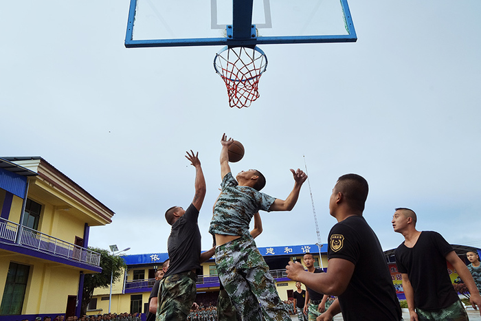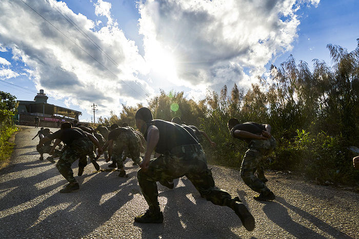 4. 阳光明媚的下午,戒毒人员在练习蛙跳。同吃、同住、同锻炼的集体生活在他们身上留下印记。每天定时锻炼身体是戒毒人员的必修课。出现毒品戒断症状只需要一个星期,身体的恢复则是一个长期工程。