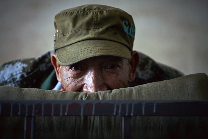 6. 一位戒毒人员在自己的上铺休息,他目光沉静,期待重回家庭。康复中心的戒毒人员横跨各个年龄层,他帽檐下的头发已经发白。