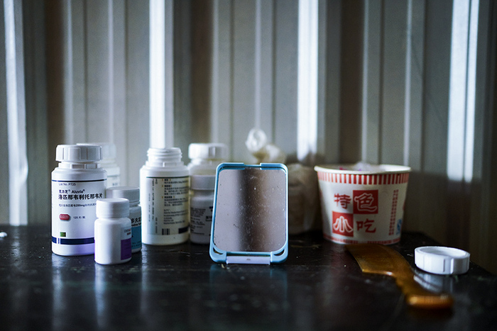 12. 艾滋病宿舍区的二楼的一间夫妻房里,桌子上摆着他们日常服用的抗病毒药物。这张桌子也是女主人的梳妆台,疾病并未夺走她对生活的期许。