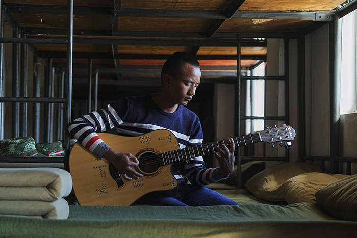 15. 一位戒毒者在宿舍弹吉他。来到康复中心之后,他为自己写了一首歌颂爱情的歌曲,名叫《追》。其中一句歌词是:“让我再抱紧你一点。”
