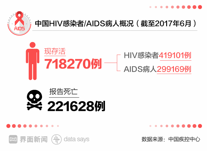 中国的首例艾滋病病例发现于1985年,一位到中国旅游的外籍人士患病入住北京协和医院后很快死亡,后被证实死于艾滋病。中国疾控中心数据显示,截至2017年6月,中国现存活71.8万例HIV感染者和AIDS病人(下称“艾滋病患者”),报告死亡22万例。