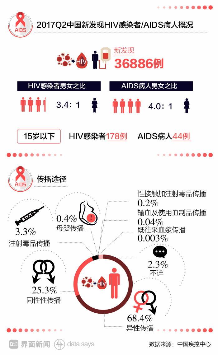 在2017年第二季度新发现的艾滋病患者中,男性患者的比例远高于女性,15岁以下的患者数合计达222例,较第一季度增加24.7%。