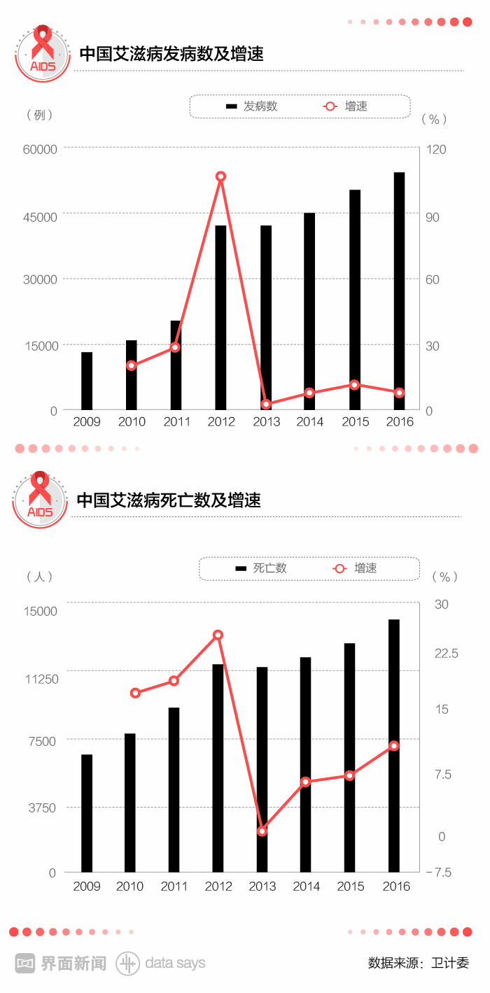 从历史数据来看,中国艾滋病发病数增速曾在2012年达到105%。经过社会各界的共同努力,2016年中国艾滋病发病数增速已较前几年明显下降。艾滋病死亡数增速水平虽然较前几年降低,但在2016年又有抬头趋势。