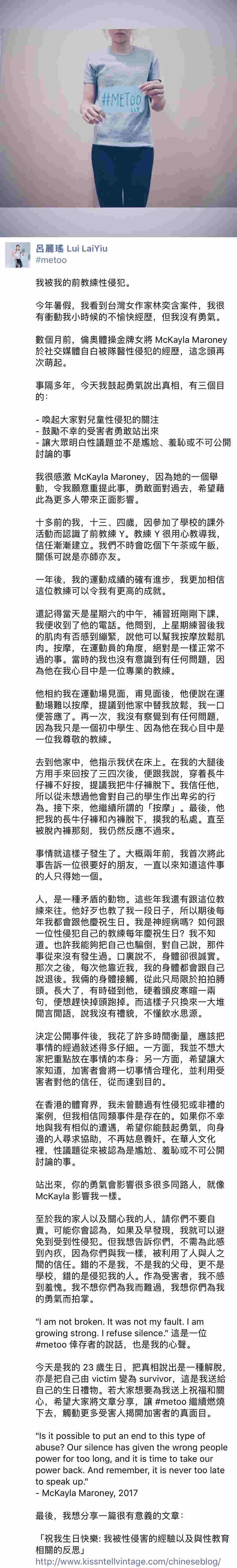 吕丽瑶写道,在大约十三四岁时,自己因参加培正中学的课外活动认识了前教练Y。有一天,Y以运动场难以按摩为由,表示要带她回家放松肌肉。出于对教练的信任,吕丽瑶没有怀疑,“最后,他把我的长牛仔裤和内裤脱下,摸我的私处。直至被脱内裤那刻,我仍然反应不过来”。