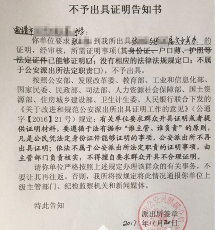 据云南网报道,11月20日,就读于云南曲靖某学校的初中生小张,被学校要求开具“我与我家亲属之间关系”的奇葩证明。当地警方霸气回应学校称,按照相关规定,公安机关已不再出具此类证明,若再让群众往返跑路,将通报学校上级主管部门、纪检监察机关和新闻媒体。