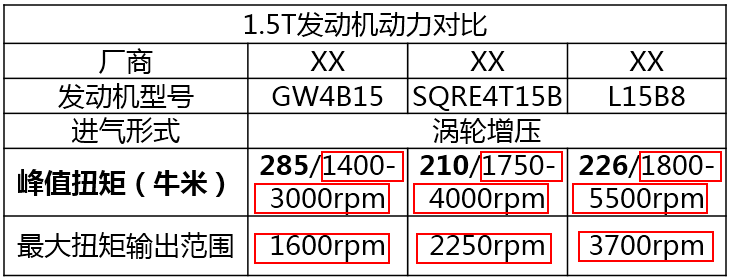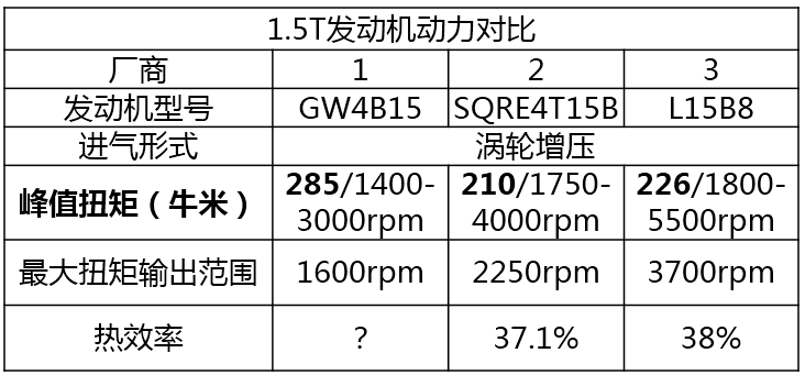 拿目前主流的3款1.5T发动机做对比,看上去大家都会认为第一款最好, 因为它的扭矩最高而且功率大。如果只看前面的动力数据,看上去并没有什么不对,但是看完后面的数据才会明白,一切是多么短暂。