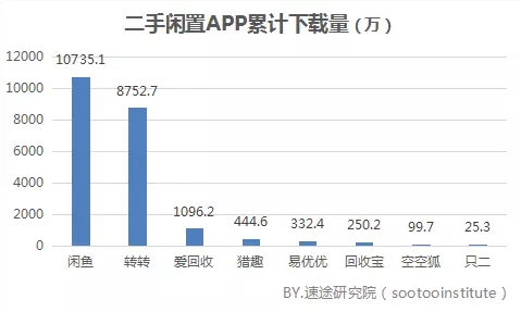 速途研究院通过对360手机助手、百度手机助手、应用宝、豌豆荚和华为应用市场5个平台的二手交易市场APP下载量统计发现,闲鱼和转转下载量远超其他平台。其中闲鱼的下载量已经突破了1.07亿次,官方统计总用户数已经达到2亿;紧随其后的转转累计下载量也已经达到了8752.7万次,两者占据了近80%的用户数。其他平台与之相比则甚显落后,若想避开两大平台的压力,从二手交易的垂直领域入手是最佳选择。