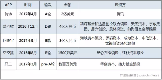 转转脱胎于58的二手频道,并于2015年11月独立运营,在2017年4月份获得了腾讯2亿美金的A轮投资;闲鱼的前身为淘宝二手,后独立运营,市值预估也已经超过30亿美元,二者成为当之无愧的领头羊;在垂直二手交易领域,二手手机平台爱回收在2016年获得了4亿元人民币的D轮融资,回收宝在2017年9月获得了海峡资本领投的3亿元人民币的B轮融资,女性时尚二手交易平台空空狐在2015年8月获得1500万美元的B轮融资,只二在2017年3月获得了pre-A轮的数百万美元的融资。