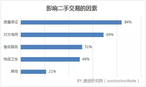 二手交易多为C2C模式,用户既可以是卖家也可以是买家,个人不同于商家,难于监管,容易造成市场鱼龙混杂的现象。平台无法制定明确的标准,商品质量更是难以保障。用户调研显示:有高达84%的用户看重二手商品的质量,尤其是手机等电子类产品。而垂直交易平台多采用C2B2C的模式,用户将商品提交至官方平台,平台进行质检和价格估算,参照一定标准将商品放在网上,公开透明,为双方减少不必要的经济和时间损失;有69%的用户会考虑对方的信用问题,主要是担心遭遇诈骗、商品掉包等情况的发生。目前闲鱼已和芝麻信用对接,用户可参考对方的芝麻信用值来决定可否放心完成交易。而转转与微信的合作,实现了二手物品在熟人间的交易,信任度更高。