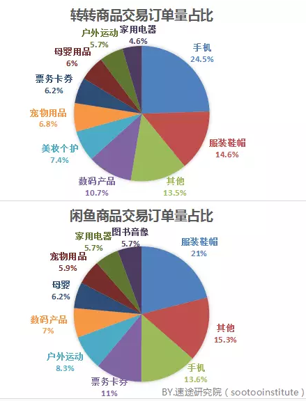 数据显示,转转平台上手机交易订单量占比最高,为24.5%,服装鞋帽和数码产品紧随其后,占比分别为14.6%和10.7%。转转的二手手机交易主要得益于转转优品,专门从事iphone回收和寄卖服务,并招募前苹果公司售后质检工程师加入,专业的质检团队,让用户不必担心手机质量和价格不成正比的问题;闲鱼的服装鞋帽订单交易比最高,主要归功于淘宝平台的流量导入。用户通过淘宝平台上的“一键转卖”可以直接转卖已购产品,流程更加简单,同时也便于买家查看产品的实际价格和图片,以作参考。
