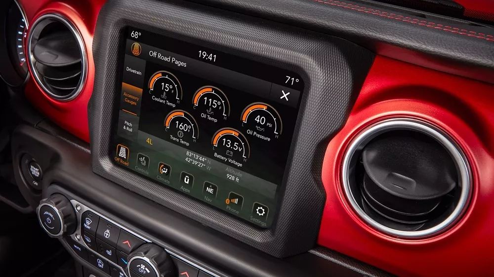 中控显示屏的尺寸为8.4英寸,除了可以显示导航、多媒体信息之外,还能显示海拔高度、经纬度位置以及润滑油温度、冷却液温度等数据。仪表盘显示屏上,还带有车辆纵向、横向倾角显示功能,这让全新牧马人表现出了更强的越野专业性。