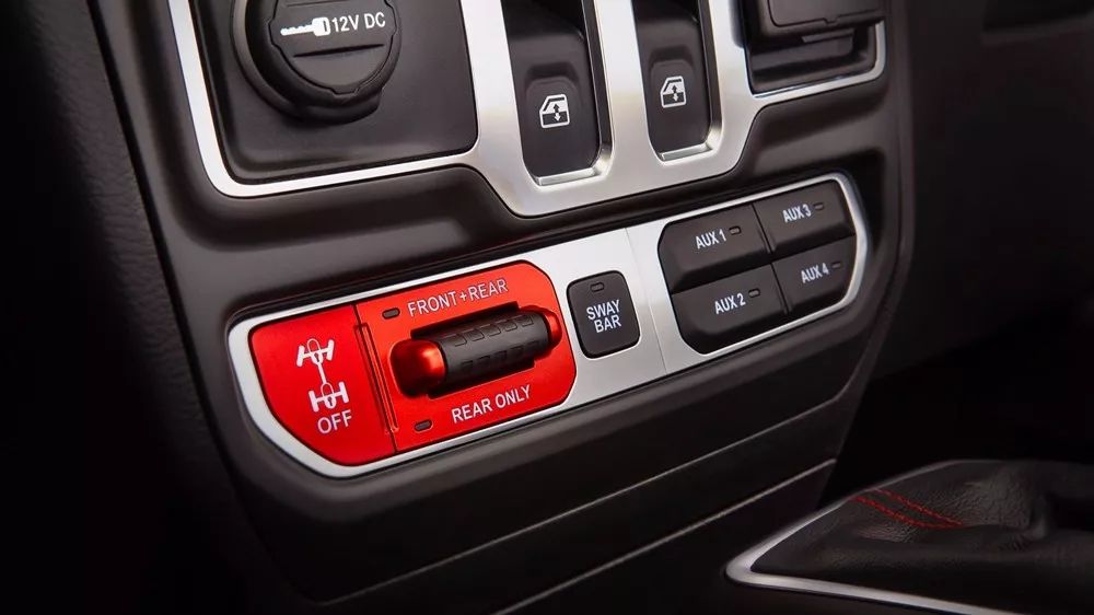 空调出风口的位置被设计在了中控屏两侧,下方为空调控制面板,车窗控制键依旧处在中控台最中央。车窗控制面板也被集成在了中控台下方区域,四驱系统则采用了红色的拨片式电子控制键。
