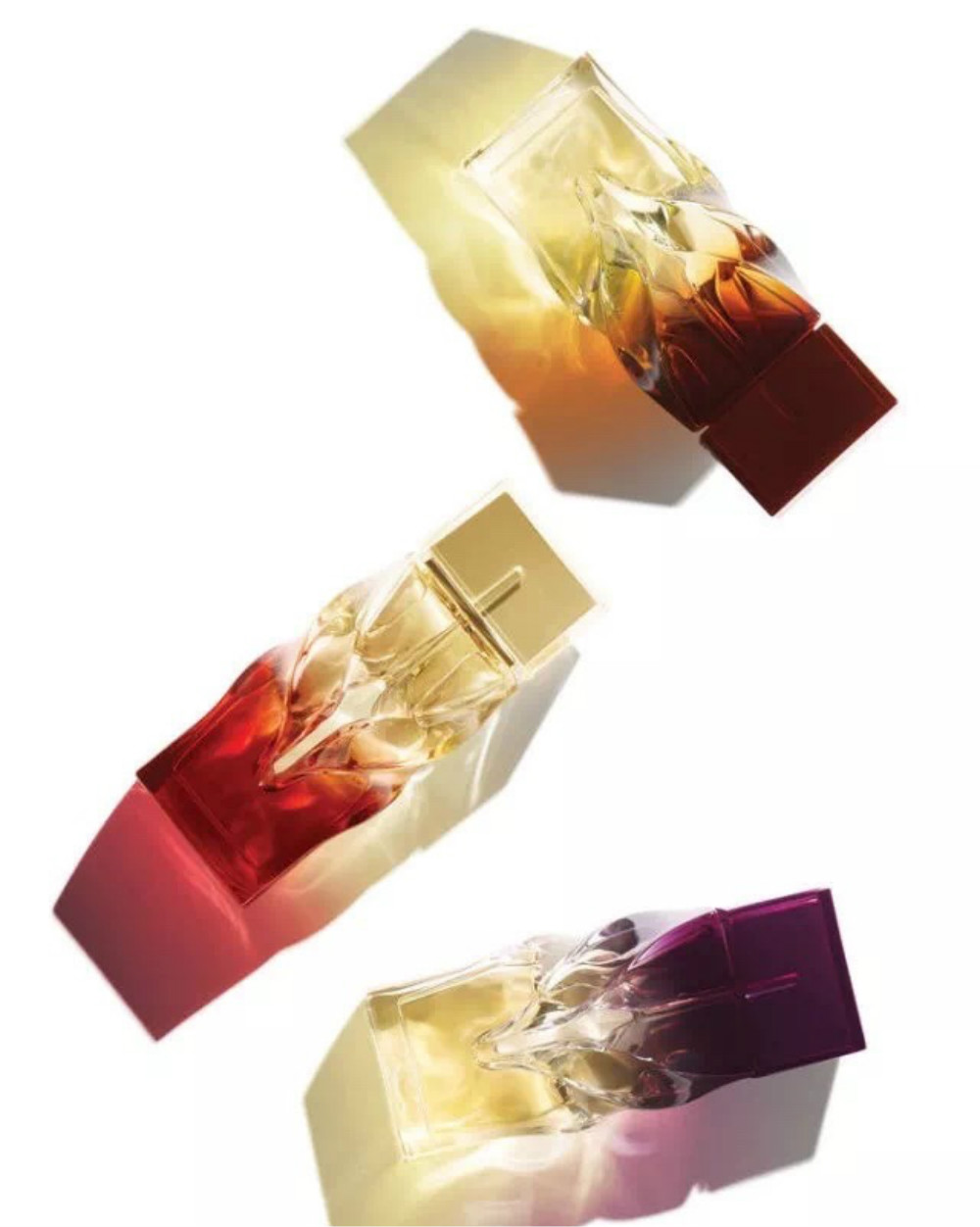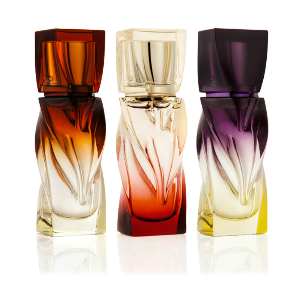 这三款香水分别是Bikini Questa Sera(今夜比基尼)、Tornade Blonde(金色龙卷风)和Trouble in Heaven(天堂的烦恼)。其中,Bikini Questa Sera 以充满热带气息的晚香玉为主,混合着茉莉和夜来香;Tornade Blonde主要原料为雪松、玫瑰、紫罗兰和黑醋粟,木调中混有花香,意为爱情和冒险;Trouble in Heaven以玫瑰为主,辅以鸢尾、广藿香、纯伏特加和东方琥珀提取物调制,让玫瑰香调变得黑暗深沉,一如从深红色到黑色的渐变色瓶身。香水瓶则由可能是当前最红的的年轻建筑设计师Heatherwick Studio 负责完成,设计灵感源于神庙门口的台柱——乍看上去是方形的瓶身中间留有圆柱状的空隙,还配有相互缠绕的花纹,渐变的颜色好像在追光捕影子,瓶身颜色变换和香调对应,也简单呼应此前发布的Christian Louboutin彩妆系列。