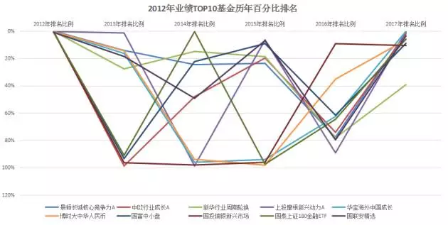 从图表中不难看出,冠军基的业绩排名跳动极大。2012年TOP10的基金中,有6只在2013年表现依然不错,但也有4只在次年的排名降到了80%以后,反差之大令人瞠目结舌。特别是2016年这10只冠军基整体变现靠后,但在今年的业绩排名中又全部回到了20%以上的位置。