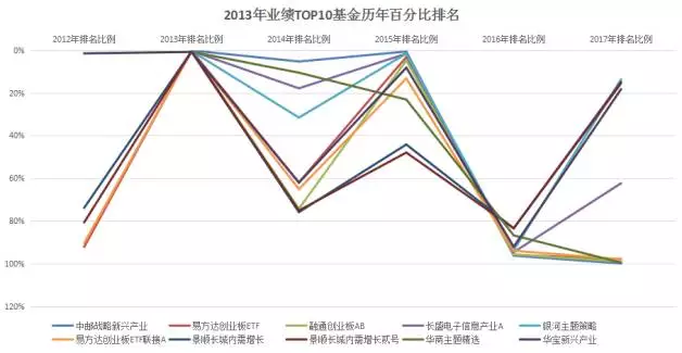 2014年业绩TOP10的基金们像在坐过山车似的,刚从13年的低谷飙升至14年的波峰,在随后的15年、16年又开始业绩落后,2017年则有那么几只领跑市场。