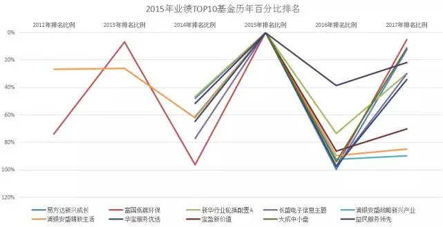 2015年的冠军基本来自于2014年的后40%的基金们,2015年的TOP10中有一只基特别“跳”,甲甲一眼就认出了它。这只基在2012年-2017年间一直保持着过山车式的排名,大起大落。而今年以来业绩可观,排在了5%左右……