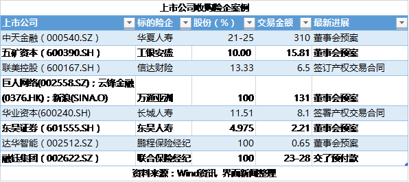 据Wind资讯数据,界面新闻整理了涉及上市公司收购保险股权的案例,今年以来共有六起涉及保险公司股权的收购交易,两起为保险经纪公司,相关交易金额超过470亿元。