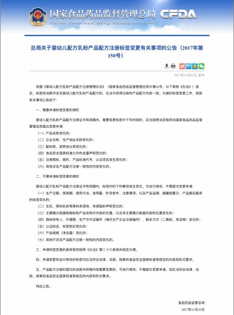 今天,国家食品药品监督管理总局在官方网站公布了关于婴幼儿配方乳粉产品配方注册标签变更有关事项的公告(2017年第150号)。根据《婴幼儿配方乳粉产品配方注册管理办法》规定,婴幼儿配方乳粉产品标签和说明书中涉及婴幼儿配方乳粉产品配方的,应当与获得注册的产品配方内容一致。上述公告列出了标签变更的细则和相关规定。