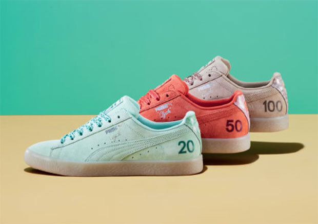 8. Puma Clyde Canadian Money 发售时间:已上架 售价:100美元 彪马以加拿大货币为灵感发售新系列,其中包括绿、红、棕三种颜色,分别代表20、50、100三种面额,鞋后跟处还印有相应的数字。鞋面由麂皮材质打造,并搭载橡胶鞋底。